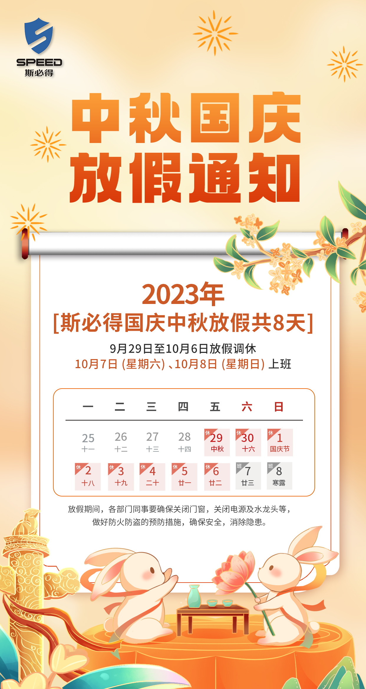 根據(jù)國務(wù)院辦公廳通知精神,現(xiàn)將2023年中秋節(jié)、國慶節(jié)放假安排通知如下:2023年9月29日(星期五)至10月6日(星期五)放假調(diào)休,共8天。10月7日(星期六)、10月8日(星期日)上班。